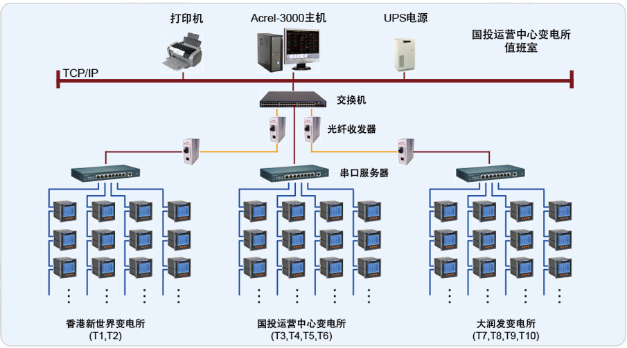 本电能管理系统主要实现先锋国际广场三个变电所的0.4kV配电系统的用电监测与电能管理;监测范围为香港新世界变电所的T1、T2,国投运营中心变电所的T3、T4、T5、T6,以及大润发变电所的T7、T8、T9、T10变压器的低压进线柜、联络柜、馈线柜中的智能电力仪表,从而实现远程实时监测和电能管理。该系统总计有420只PZ80-E4/C仪表,分20条总线,由于三个变电所之间距离较远,并且较为分散,采用每个变电所内自行组网,然后通过先锋国际的视频监控光纤传至到国投运营中心的消控中心,通过光电转换器和交换机,连接至监控电脑,实该现场总线上仪表与监控主机的数据连通。