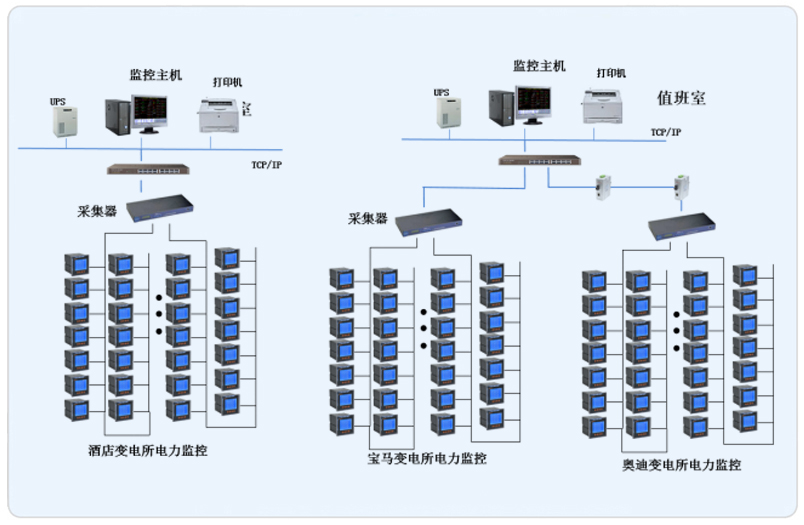 本项目根据管理区域设置两套Acrel-2000型电力监控系统,系统采用网络分布式结构,其中宝马奥迪主机设置在地下配电值班室,酒店设置在一楼值班室。所有配电回路均配备安科瑞电力仪表PZ系列。该项目实现了3个变电所内电力系统的智能管理。所有监控设备均通过屏蔽双绞线至各自配电室内的通讯管理机,从而实现远程监控。