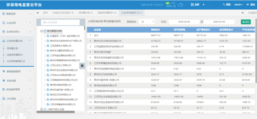 企业用电数据分析:按年/月/日统计企业以及行政区域的总用电情况,可导出成报表。