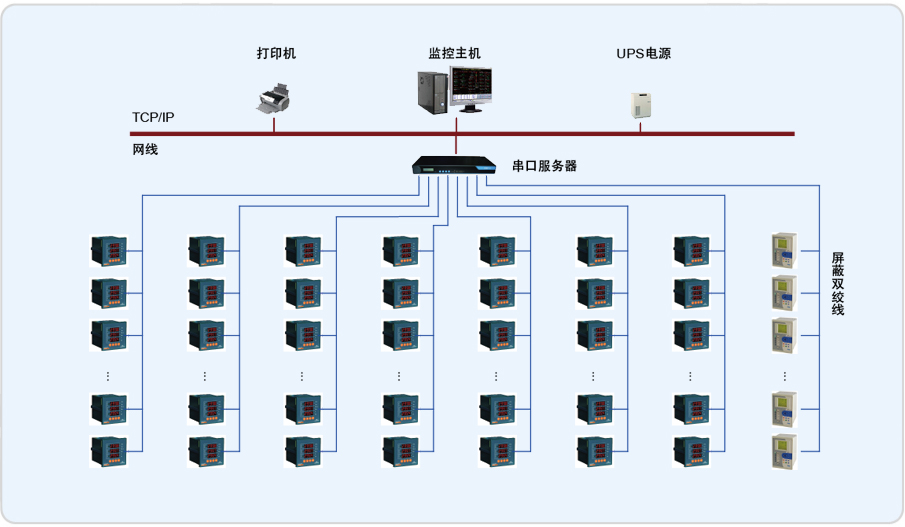 Acrel–2000软件通过中间采集设备采集现场电力监控仪表数据,并在系统一次图显示出来。主要实现功能如:远程抄表查,询各个配电室各个回路按照时间段进行历史数据查询。趋势曲线,功率实时趋势显示及历史趋势查询功能。系统遥信状态报警,根据本系统的设计意图,如果重要回路或者照明回路三相中某一相电流负荷超过额定值的90%,系统必须立刻发出声光报警并弹出指示框指明报警源,提醒管理人员注意负载的三相平衡和负载率,同时自动记录事件发生的时间和回路名称,以便用户查询,追忆故障原因。