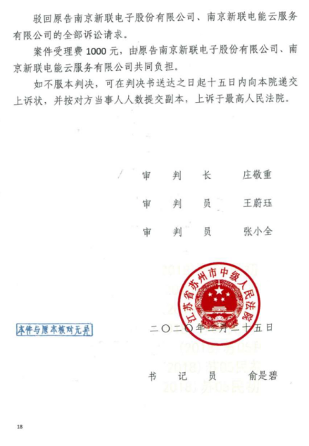 近日安科瑞收到江苏省苏州市中级人民法院(以下简称“苏州中院”)的《民事判决书》((2018)苏 05 民初 1000 号),就原告南京新联电子股份有限公司、南京新联电能云服务有限公司(以下简称“新联公司”)与被告安科瑞电气股份有限公司、江苏安科瑞电器制造有限公司(以下简称“安科瑞”)侵害发明专利权纠纷一案作出判决。