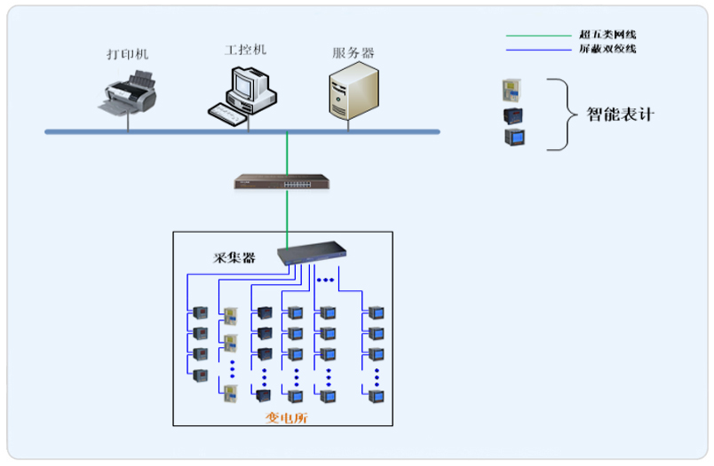 系统采用Acrel-2000型电能管理系统,整个系统采用网络分布式结构,监控主机位于变电所内值班室,变电所内配置一套采集设备进行数据的采集,所有配电回路均配备智能仪表。该项目实现了安国酒店变电所的配电回路重要数据的实时采集,存储,显示。所有监控设备均通过屏蔽双绞线连接至采集箱的通讯采集器,再通过网线将数据传输至系统主机,从而实现电力监控系统的整体搭建。