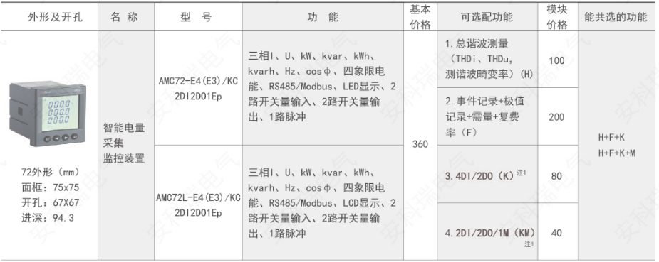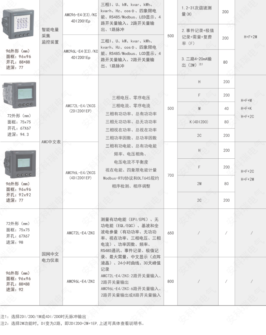 AMC 系列可编程智能电测仪表是针对电力系统、工矿企业、公用设施、智能大厦的电力监控需求而设计的智能仪表,它集成电力参数的测量(如单相或者三相的电流、电压、有功功率、无功功率、视在功率、频率、功率因数)以及电能监测和考核管理。采用高亮度 LED/LCD 显示界面,通过按键来实现参数设置和控制,非常适用于实时电力监控系统。可以直接取代常规电力变送器及测量仪表。作为一种智能化、数字化的前端采集元件,该仪表已广泛应用于各种控制系统、SCADA 系统和能源管理系统中。