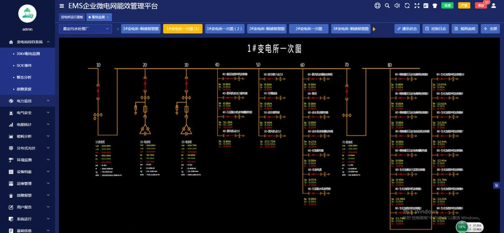 嘉定污水处理厂EMS电能管理系统项目分为三个低配间,两个箱变和光伏设备,做到数据互通,电力数据实时显示在电力一次图上面。