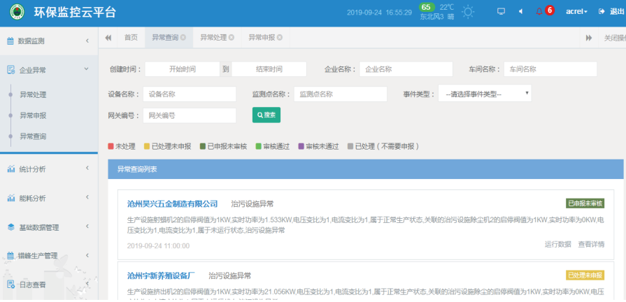 企业运行状态统计:按年/月/日统计分析企业、监测点、产污设施、治污设施等异常产生的情况。