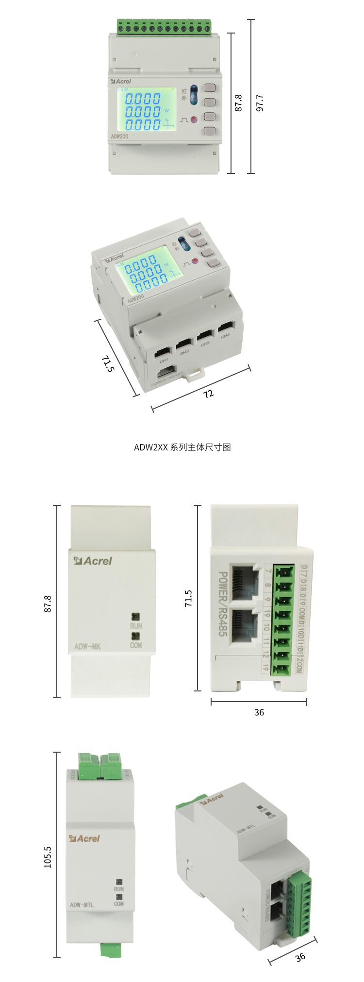 ADW2xx系列导轨式多回路电力仪表方便用户进行用电监测、集抄和管理。可灵活安装于配电箱内,实现对不同区域和不同负荷的分项电能计量,统计和分析。