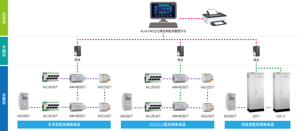 适用于医院的手术室、各类重症监护室、抢救室、血透中心、内窥镜室及造影室等医疗2类场所的医用隔离电源系统的远程监控及自动化管理。