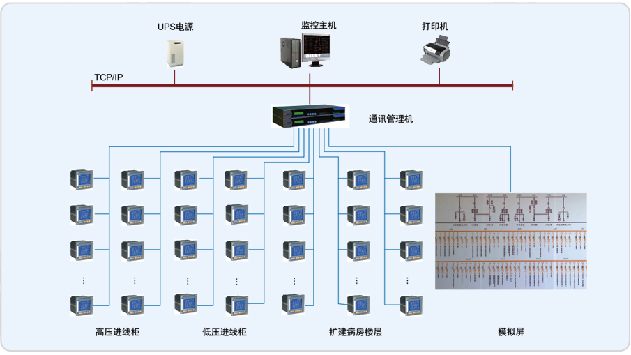 甘上海华山医院病房楼是一幢医用建筑,建筑面积约为2万平方米。根据配电系统管理和能耗监测的要求,需要对楼内的高压进线、低压配出线和各楼层内配电箱进行电力监控,以保证用电的安全、高效。