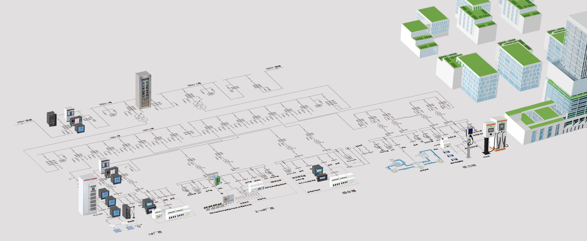 电力监控系统实现对园区变电站、配电房内断路器、变压器、柴油发电机以及其它重要设备进行监视、测量、记录、报警等功能,并与保护设备和远方控制中心及其他设备通信,实时掌握园区变电站和配电房运行状况,快速排除故障,保障园区供电可靠性。