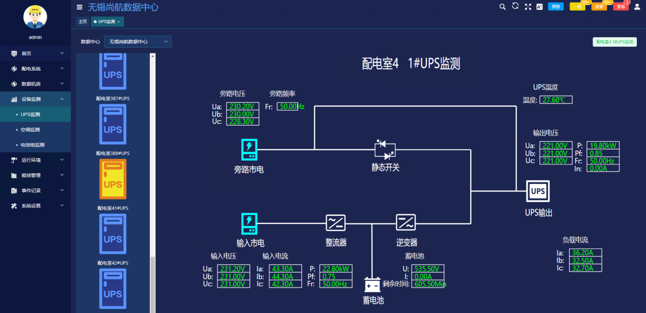 系统采集UPS输入、输出端和旁路三相电压、电流、有功功率、功率因数频率,同时监测UPS温度、蓄电池电压、当前负载下的剩余时间等数据,检测到异常时会及时发出告警信号,告警信号也可以根据紧急程度进行分级。