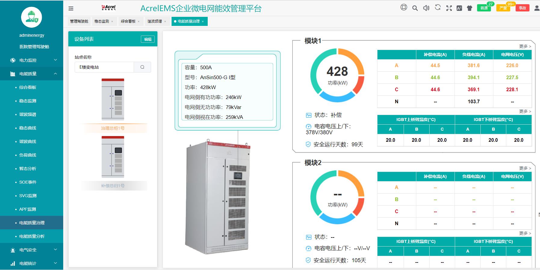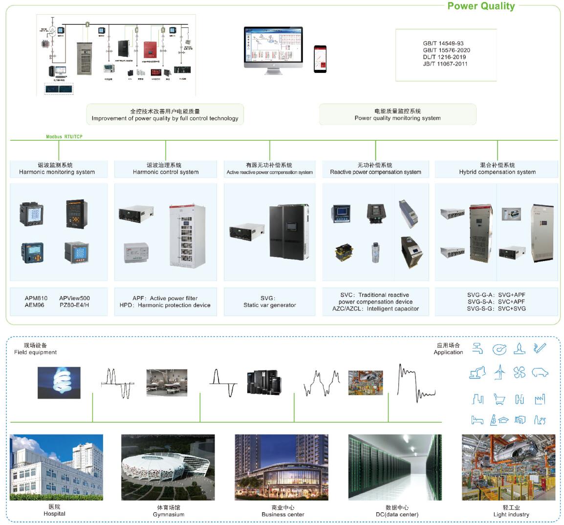 电能质量分析与治理系统主要是研究消除供配电系统中的无功补偿和谐波治理问题,主要的产品有有源电力滤波器、低压无功功率补偿装置、静止无功发生器、混合动态滤波补偿装置、混合动态消谐补偿装置、智慧型动态无功补偿装置、谐波保护器等,适用于新建、改建、扩建和技改项目中工业与民用及公共建筑内电气设备的无功补偿、谐波抑制及综合治理等,可根据不同行业类型和负载类型的电能质量问题提供合适的设计解决方案,以达到改善供电质量和确保电力系统安全经济运行的目的。